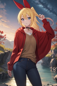 <lora:Chitoge-000008:0.8>,Chitoge CYQL,1girl,looking at viewer,solo,long hair,blonde hair,hair between eyes,ribbon,hair ribbon,red ribbon,hair bow,blue eyes,choker,Aran sweater poncho paired with skinny jeans and suede ankle boots,happy,cowboy_shot,Canyon, River, Cliffs, Rapids, Canyon walls, Wildlife, Echoes, Adventure,(Japanese maples, Zen garden, Red foliage, Stone lanterns, Autumnal hues, Japanese serenity:0.5),beautiful detailed sky,beautiful detailed glow,posing in front of a colorful and dynamic background,masterpiece,best quality,beautiful and aesthetic,contrapposto,female focus,wallpaper,