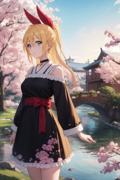 <lora:Chitoge-000008:0.8>,Chitoge CYQL,1girl,looking at viewer,solo,long hair,blonde hair,hair between eyes,ribbon,hair ribbon,red ribbon,hair bow,blue eyes,choker,Architectural one-shoulder mini dress with exaggerated flounce,teardrop,profile,Cherry blossoms, Garden, Petals, Blossoming trees, Serenity, Zen, Pond, Bridges,(Olive trees, Tuscan villa, Rolling hills, Harvested olives, Warm sunlight, Cypress trees:0.5),beautiful detailed sky,beautiful detailed glow,posing in front of a colorful and dynamic background,masterpiece,best quality,beautiful and aesthetic,contrapposto,female focus,wallpaper,