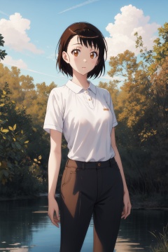 <lora:Kosaki-000013:0.8>,Kosaki CYQL,1girl,looking at viewer,solo,brown hair,short hair,asymmetrical hair,brown eyes,Casual and comfortable style with a polo shirt, tailored pants, and loafers,kind_smile,full_shot,Mangroves, Swamp, Mud, Roots, Tidal channels, Crabs, Mosquitoes, Biodiversity,(Lavender rows, Purple hues, Evening glow, Fragrant air, Harvest time, Provencal landscape:0.5),beautiful detailed sky,beautiful detailed glow,posing in front of a colorful and dynamic background,masterpiece,best quality,beautiful and aesthetic,contrapposto,female focus,wallpaper,