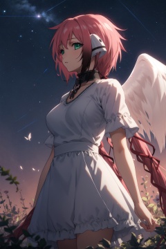 <lora:Ikaros-000009:0.8>,ikaros cyql,1girl,looking at viewer,solo,pink hair,long hair,very long hair,twintails,robot ears,hair ribbon,green eyes,collar,metal collar,chain,wings,angel wings,large breasts,Gingham checkered dress,teardrop,profile,As darkness falls, the sky twinkles with countless stars, the Milky Way spanning across the heavens. A gentle breeze rustles through the grass, and the distant howl of wolves intermingles with the chirping of insects,(Bluebells, Beech trees, Misty dawn, Carpet of flowers, Early morning light, Birdsong:0.5),beautiful detailed sky,beautiful detailed glow,posing in front of a colorful and dynamic background,masterpiece,best quality,beautiful and aesthetic,contrapposto,female focus,wallpaper,