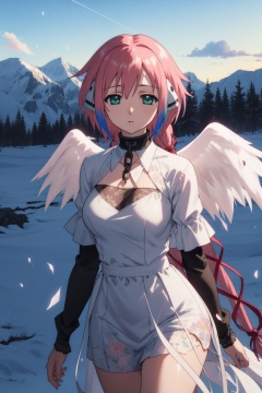<lora:Ikaros-000009:0.8>,ikaros cyql,1girl,looking at viewer,solo,pink hair,long hair,very long hair,twintails,robot ears,hair ribbon,green eyes,collar,metal collar,chain,wings,angel wings,large breasts,Romantic tiered lace and tulle gown,drunk,bust,High above, a vast meadow stretches to the horizon, dotted with wildflowers. Cattle and sheep graze leisurely while snow-capped mountains encircle the scene in the distance,(Roses, Tea roses, Tea table, Vintage teacups, Tea party, English charm:0.5),beautiful detailed sky,beautiful detailed glow,posing in front of a colorful and dynamic background,masterpiece,best quality,beautiful and aesthetic,contrapposto,female focus,wallpaper,