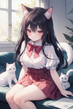 masterpiece, best quality, {best quality}, {{masterpiece}}, {high resolution}, focus, anime style, Cartoon close-up of a woman, girls design, portrait, gisha, anime image, long hair, black hair, Look straight into the eyes, hair covering ears, happy, Polished and powerful look, out of tune, High, freckle, Smile, chic, rich and colorful, color, beautiful hair、 beautiful eyes、 beautiful skin、beautiful legs、beautiful arms、perfect fingers、 Very cute,white hair, long hair,white cat ears, white cat tail,best quality,High resolution,top quality,pink bow,slender eyebrows,hair slightly moist,little girl,very young,18 years old,Shy的Smile,Lift up most of the skirt with both hands,Wearing black knee-high socks on the right leg,Wearing white knee socks on left leg,tall figure,pink bow ,Red eyes,white skirt,Blushed,Shy ,plump breasts