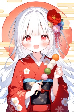 artist:yuki,1girl,loli,solo,long hair,looking at viewer,blush,smile,open mouth,bangs,hair ornament,red eyes,long sleeves,holding,upper body,flower,white hair,:d,food,japanese clothes,hair flower,wide sleeves,blunt bangs,kimono,sash,obi,hair intakes,floral print,red flower,red kimono,print kimono,wagashi,egasumi,moch