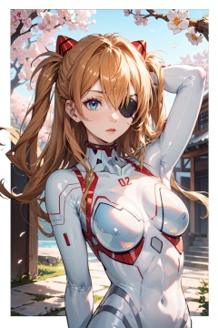<lora:Asuka-000018:0.8>,Asuka CYQL,1girl,looking at viewer,solo,long hair,blue eyes,interface headset,brown hair,orange hair,hair between eyes,two side up,medium breasts,(Asuka White,eyepatch,plugsuit,bodysuit,white bodysuit,skin tight),(shy:1.2),beautiful face,beautiful eyes,glossy skin,shiny skin,(upper_body,foreshortening,stretching:1.2),hand in panties,Cherry blossoms, Garden path, Dawn light, Sakura petals, Tranquil setting, Japanese elegance,Cosmos flowers,beautiful detailed sky,beautiful detailed glow,(English text:1.3),(border:1.5),posing in front of a colorful and dynamic background,(masterpiece, best quality, beautiful and aesthetic:1.3),contrapposto,female focus,fine fabric emphasis,wallpaper,fashion,Lipstick,depth of field,intricate_detail,finely_detailed,fine_fabric_emphasis,(glossy),<lora:增强减少细节add_detail:0.3>,