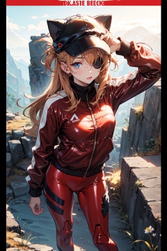 <lora:Asuka-000018:0.8>,Asuka CYQL,1girl,looking at viewer,solo,long hair,blue eyes,interface headset,brown hair,orange hair,hair between eyes,two side up,medium breasts,(plugsuit,eyepatch,hat,jacket,animal hat,bodysuit,red jacket,track jacket,cat hat,black headwear,bodysuit under clothes,red bodysuit,hat ornament,long sleeves,zipper,turtleneck),(expressionless:1.2),beautiful face,beautiful eyes,glossy skin,shiny skin,(bust,from_above,wariza:1.2),thumbs up,Mountain peak, Sunrise, Hiking trail, Morning colors, Summit view, Adventure,Irises,beautiful detailed sky,beautiful detailed glow,(English text:1.3),(border:1.5),posing in front of a colorful and dynamic background,(masterpiece, best quality, beautiful and aesthetic:1.3),contrapposto,female focus,fine fabric emphasis,wallpaper,fashion,Lipstick,depth of field,intricate_detail,finely_detailed,fine_fabric_emphasis,(glossy),<lora:增强减少细节add_detail:0.3>,
