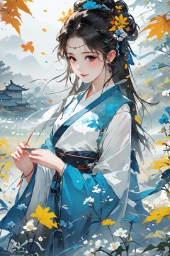 (Masterpiece), (best quality), illustrations, super detailed, HDR, depth of field, (color), loli, 1 girl, solo, maple leaf, autumn leaf, smile, leaf, holding a leaf, looking at the audience, blurry, Hanfu, bun, simple hair accessories, bracelet, Hanfu<lora:EMS-399285-EMS:1.000000>