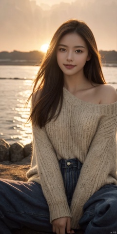 best quality, masterpiece, realistic,cowboy_shot,(Good structure), DSLR Quality,Depth of field,kind smile,looking_at_viewer,Dynamic pose, ultra-high definition,extreme detail,8k,realistic,(masterpiece:1.3),(best quality:1.3),(photorealistic:1.4),realistic,4k,detail face (dark scene, soft lighting, high saturated):1.4, vivid illumination, enchanting elegance, atmospheric depth, masterful technique, naturalistic representations, harmonious composition, creative refinement, striking juxtapositions, (1girl, young beauty), sitting, , looking at viewer, from above, sharp focus, oversized_sweater, shoulder, ((sunset)),volumetric fog, outdoors, backlight, , ,