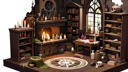 masterpiece,best quality,<lora:gamebg:0.5>,realistic,white background,1girl,witch,room-style,old wooden flooring,mystical symbols,dark stone walls,cobwebs,moss,ancient tattered tapestries,bookshelves,gothic windows,stained glass,broken glass,large stone fireplace,potion bottles,magical tools,large dusty wooden workbench,herbs,potions,magical books,dark alchemy furnace,dusty cabinet filled with herbs and minerals,dried plants,dried animal specimens,intricate faded magic circle,old armchair,ancient globe,dim lighting,candles,dripping wax,large rusty cauldron,strange tools,unusual plants,evil symbols,incantations,skulls,bones,dark altar,black candles,offerings,bloodstains,