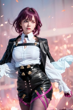 masterpiece, best quality, realistic, (photoshop \(medium\):1.4),<lora:kafka:1>,kafka (honkai: star rail), 1girl, solo, long hair, breasts, purple hair, shirt, gloves, looking at viewer, eyewear on head, long sleeves, white shirt, large breasts, bangs, sunglasses, jacket, scathach (fate), shorts, closed mouth, pantyhose, purple gloves, thigh strap, purple eyes, open clothes, hair between eyes, black shorts, black jacket, cowboy shot