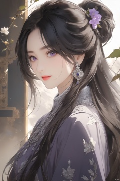 (masterpiece, best quality:1.3),a woman with long hair and a necklace,cn_paper_cut,paper_cut style,8k,intricate,elegant,highly detailed,majestic,digital photography,cowboy shot,surreal painting,broken glass,(masterpiece, sidelighting, finely detailed beautiful eyes:1.2),HDR,Black eyes,gongbihua,masterpiece,a painting,1girl,((upper body)),((background is full of flowers and leafs)),skin Chinese,eyelashes (hansong:1.3),look at viewer,face front,(hair scrunchie:1.2),whole body,purple clothes,looking at the audience,smiling,long hair,delicate face,realistic woman,