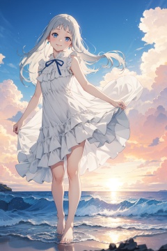 <lora:Menma-000015:0.9>,Menma CYQL,1girl,looking at viewer,solo,long hair,grey hair,blue eyes,smile,dress,ribbon,sleeveless,sleeveless dress,white dress,barefoot,full body,standing,frills,bust,Coral, Fish, Seaweed, Sunlight, Clear water, Diverse marine life, Colorful, Serenity,(Cherry blossoms, Garden path, Dawn light, Sakura petals, Tranquil setting, Japanese elegance:0.5),beautiful detailed sky,beautiful detailed glow,posing in front of a colorful and dynamic background,masterpiece,best quality,beautiful and aesthetic,contrapposto,female focus,wallpaper,
