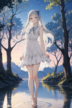 <lora:Menma-000015:0.9>,Menma CYQL,1girl,looking at viewer,solo,long hair,grey hair,blue eyes,smile,dress,ribbon,sleeveless,sleeveless dress,white dress,barefoot,full body,standing,frills,upper_body,Lake, Lakeside, Forest, Trees, Reflection, Serenity, Wildlife, Tranquility,(Bluebells, Beech trees, Misty dawn, Carpet of flowers, Early morning light, Birdsong:0.5),beautiful detailed sky,beautiful detailed glow,posing in front of a colorful and dynamic background,masterpiece,best quality,beautiful and aesthetic,contrapposto,female focus,wallpaper,