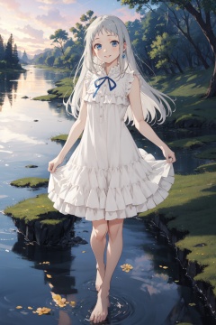 <lora:Menma-000015:0.9>,Menma CYQL,1girl,looking at viewer,solo,long hair,grey hair,blue eyes,smile,dress,ribbon,sleeveless,sleeveless dress,white dress,barefoot,full body,standing,frills,cowboy_shot,Mangroves, Swamp, Mud, Roots, Tidal channels, Crabs, Mosquitoes, Biodiversity,(Roses, Tea roses, Tea table, Vintage teacups, Tea party, English charm:0.5),beautiful detailed sky,beautiful detailed glow,posing in front of a colorful and dynamic background,masterpiece,best quality,beautiful and aesthetic,contrapposto,female focus,wallpaper,
