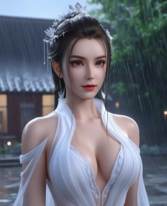 <lora:612-DA-XL-少年白马醉春风-玥瑶:0.8>(,1girl, ,best quality, ),looking at viewer,masterpiece, (( , )),,ultra realistic 8k cg, ,      ,building, bare_shoulders,cleavage cutout, eyelashes,magic,hydrokinesis,sweat, wet, rain, ,       (cleavage), (),