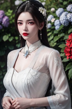 best quality,masterpiece,Xlimuwan,1girl,solo,very long hair,looking at viewer,jewelry,closed mouth,purple eyes,upper body,purple hair,earrings,blurry,blurry background,sunlight,red lips,(big breasts:1.23),Xlimuwan,X-Hydrangea, traditional chinese ink painting,ll-hd,