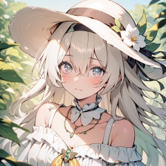 1girl, solo, hat, dress, flower, long hair, jewelry, white hair, green eyes, necklace, looking at viewer, white flower, bare shoulders, outdoors, white dress, white headwear, leaf, off-shoulder dress, hair over one eye, off shoulder, blush, bangs, sun hat, collarbone, hat flower, closed mouth, plaid, frills, frilled dressfirefly,
