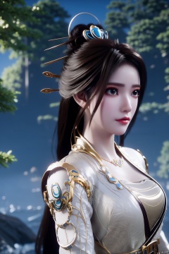1girl, solo, long hair, black hair, hair ornament, dress, jewelry, outdoors, hair bun, white dress, tree, night, single hair bun, light,Xyaoxi