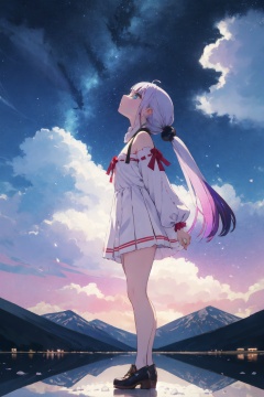 <lora:Kanna-000015:0.9>,kanna cyql,1girl,looking at viewer,solo,long hair,purple hair,blunt bangs,twintails,low twintails,multicolored hair,blue eyes,child,Sculptural one-shoulder dress with oversized pleated details,grin,profile,On clear days, the salt lake becomes a colossal mirror, reflecting the sky and clouds above. White salt flats stretching towards distant mountains paint a surreal scene,(Boxwood hedges, Statues, Formal parterres, Fountain, Classic architecture, Symmetry:0.5),beautiful detailed sky,beautiful detailed glow,posing in front of a colorful and dynamic background,masterpiece,best quality,beautiful and aesthetic,contrapposto,female focus,wallpaper,