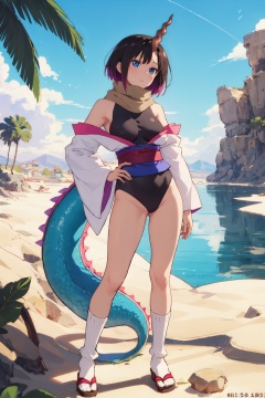 <lora:Elma-000013:0.8>,Elma CYQL,1girl,looking at viewer,solo,dragon girl,short hair,black hair,purple hair,multicolored hair,gradient hair,horns,single horn,dragon horns,blue eyes,sash,japanese clothes,scarf,obi,breasts,black leotard,leotard,large breasts,kimono,leotard under clothes,off shoulder,bare shoulders,tail,dragon tail,socks,giggling,panorama,Amidst the boundless expanse of sand, a verdant oasis stands like a mirage, where clear pools are shaded by date palms,(Water lilies, Lotus flowers, Cattails, Willow trees, Reflections, Warm hues:0.5),beautiful detailed sky,beautiful detailed glow,posing in front of a colorful and dynamic background,masterpiece,best quality,beautiful and aesthetic,contrapposto,female focus,wallpaper,
