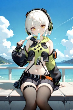ask_(askzy), 1girl,solo,(masterpiece:1.3),( beautiful:1.2),(high quality:1.2),(finely detailed:1.2),extremely detailed CG unity 8k wallpaper,best quality,a very delicate and beautiful,perfect fingers,(one cute girl at the center:1.2),1girl, solo, looking at viewer, short hair, bangs, skirt, thighhighs, gloves, long sleeves, navel, sitting, jacket, yellow eyes, white hair, pleated skirt, outdoors, detached sleeves, food, sky, day, black gloves, midriff, belt, artist name, black thighhighs, cloud, miniskirt, fingerless gloves, black skirt, blue sky, zettai ryouiki, crop top, thigh strap, headphones, bob cut, popsicle, food in mouth,anby