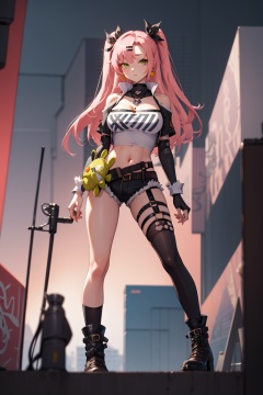<lora:Nicole-000010:1>,Nicole CYQL,1girl,looking at viewer,solo,long hair,pink hair,hair ribbon,black ribbon,two side up,hairclip,mole under eye,green eyes,bare shoulders,shoulder cutout,large breasts,mole,strapless,tube top,cleavage,long sleeves,midriff,crop top,cutoffs,black shorts,single thighhigh,clothing cutout,belt,thigh strap,socks,black footwear,boots,bored,panorama,Public art, Sculptures, Installations, Expression, Creativity,beautiful detailed sky,beautiful detailed glow,posing in front of a colorful and dynamic background,masterpiece,best quality,beautiful and aesthetic,contrapposto,female focus,wallpaper,