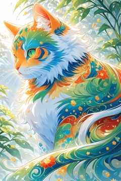 Enamel, a colorfully patterned, fluffy cat, creates an ethereal atmosphere. It was created using digital painting techniques to highlight its fine textures and intricate details. This artwork showcases superb craftsmanship and vibrant tones in a paint-by-numbers style,