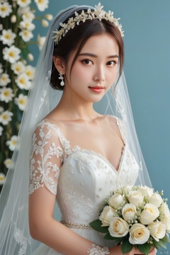 1girl, solo, breasts, looking at viewer, brown hair, black hair, dress, holding, cleavage, brown eyes, jewelry, upper body, flower, earrings, white dress, lips, white flower, veil, bouquet, wedding dress, realistic, bridal veil, holding bouquet, bride