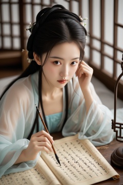 从上往下看,一位优雅的中国年轻女子,趴在桌子前练习书法,宣纸上写着汉字"长相思",穿着传统服饰,柔焦,柔和的光线,逼真,富有表现力的眼睛,,当代摄影,灵感来自中国古典绘画美学,杰作