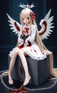 masterpiece,best quality,high quality,realistic,1girl, blood, wings, long hair, barefoot, chain, angel wings, halo, dress, white dress, blood on hands, blood on clothes, angel, red eyes, sitting, cuffs, solo, feathered wings, ankle cuffs, shackles, blood from eyes, bow, hair bow, blood on face, blonde hair, very long hair, white wings, looking at viewer, red bow, full body, red nails, knees together feet apart, long sleeves, crying, crying with eyes open, own hands together, frills, blood on leg, chained, tears, nail polish, blood stain, closed mouth, feet, bound, toenails, frilled dress, broken chain, blood on arm