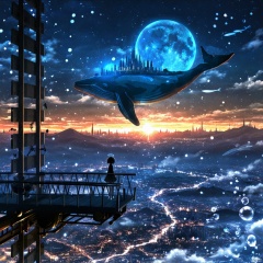 s-style, 剪影画, 空灵的氛围, 天空, 蓝色和橙色和黑暗主题, 明星(符号), 没有人类, 夜, 建筑, 明星(天空), 风景, 1girl, 城市灯光, 鲸鱼, 云, 月亮, 夜空, 星空, 鱼, 泡沫, 城市, 城市景观, 超现实, 超现实和未来派的夜间场景, 一个巨大的金属平台, 一个女孩的黑色轮廓站在上面, 凝视着下面的广阔天地, 平台很高, 似乎连接着一座又高又细的塔, 一条漂浮在天空中的巨大鲸鱼蓝色和橙色的轮廓, 它已变成一座漂浮的城市。这座城市装饰着各种结构, 包括圆顶和其他建筑奇迹, 下面的城市被无数的灯光照亮, 暗示着繁华的城市环境, 天空充满了星星和无数的天体, 包括一个大的明亮的月亮, 奇迹和神秘和敬畏, 平台, 塔, 圆顶, 建筑奇迹, 星星, 气氛