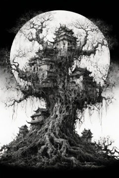 A detailed ink drawing of an ancient tree with gnarled branches, twisting roots holding a small village in its embrace, intricate houses built into the tree, moonlight shining through the leaves, fantasy realism, high contrast shading, hd quality,ink_style