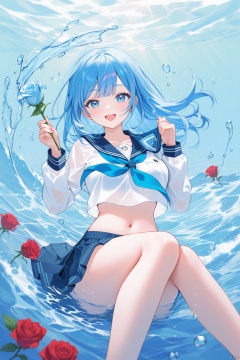1girl, barefoot, solo, skirt, water, holding, blue_eyes, navel, shirt, school_uniform, sailor_collar, neckerchief, blue_skirt, white_shirt, looking_at_viewer, long_sleeves, pleated_skirt, blue_hair, smile, breasts, flower, serafuku, bare_legs, open_mouth, midriff, stomach, feet, crop_top, large_breasts, thighs, :d, miniskirt, blue_sailor_collar, rose, toes