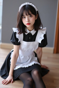 A realistic, photorealistic image of a solo girl with medium-length black hair and black eyes, wearing a maid apron and black thigh-highs, sitting on the floor with her gaze looking directly at the viewer. The scene is set indoors, with a blurry background that adds depth to the image. The girl's attire includes a frilled black dress, red lips, and no shoes, with short sleeves and a full body visible. The image showcases a realistic style, emphasizing the depth of field and the maid's wariza expression.