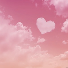 a heart-shaped shadow can be seen against a backdrop of a pink sky filled with fluffy white clouds. The heart is positioned in the center of the frame