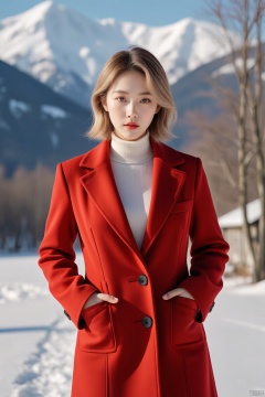 Outdoor scenery, snow view, Snow Mountain, girl, red wool coat, pretty face, short hair, blonde hair, (photo reality: 1.3) , Edge lighting, (high detail skin: 1.2) , 8K Ultra HD, high quality, high resolution, the best ratio of four fingers and thumb, (photo reality: 1.3) , wearing a red coat, white shirt inside, large breasts, solid red background, solid red background, superior feeling, full texture, 1 girl,