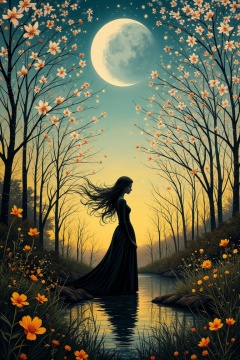 Surrealist oil painting featuring a silhouetted woman in a long black dress with flowing hair standing amidst delicate blooming trees under a large crescent moon, smaller orbs against a teal and yellow gradient sky, wildflowers and grasses detailed in the foreground, reflective water and distant treeline in the background, contrasting light and dark elements with intricate patterns and textures in the foliage, ethereal and mystical atmosphere, soft brushstrokes creating a dreamlike quality,PatternMix,