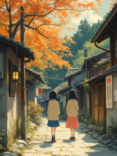 OBfencai,This is a vibrant, digitally created illustration in a semi-realistic, anime-inspired style. The scene depicts two young girls, each with short, dark hair, standing on a narrow, stone-paved path that leads away from the viewer. They are dressed in traditional Japanese school uniforms: the girl on the left wears a beige coat over a blue skirt, while the girl on the right wears a similar outfit but in light pink. The path is flanked by old, weathered buildings with wooden facades and tiled roofs, characteristic of traditional Japanese architecture. To the left, a wooden pole with a lantern hangs from a tree branch adorned with autumn leaves in shades of orange and yellow. To the right, a sign with Japanese characters and a red heart is posted on a wooden wall.