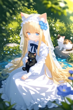 1girl, cat, flower, dress, solo, animal ears, long hair, bow, blonde hair, sitting, white dress, looking at viewer, long sleeves, veil, blush, cat ears, bangs, animal, blue eyes, puffy sleeves, frills, blurry, hair ornament, hair flower, blurry foreground, closed mouth, very long hair, water, lolita fashion, depth of field