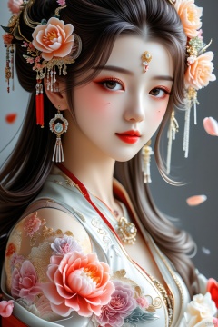 1girl, rose petals, hair adornment, floral hairpiece, solitary beauty, sparkling earrings, delicate jewelry, traditional chinese attire, staring at viewer, enchanting forehead symbol, glossy black hair, cascading long hair, flawless makeup, mesmerizing brown eyes, vibrant red lips, exquisite facial design.
