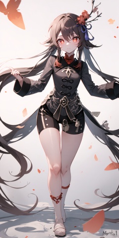 hutao,(masterpiece),(best quality),illustration,ultra detailed,hdr,1girl,hair rings, solo,petite, long hair, very long hair, absurdly long hair, barefoot, looking at viewer, symbol-shaped pupils, white hair, dress, bangs, green eyes, full body, breasts,cross-shaped pupils, hair ornament, white hair, green hair, gradient hair, white dress, hutao (genshin impact)