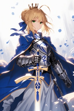 1girl, solo, looking at viewer, short hair, bangs, blonde hair, long sleeves, dress, bow, ribbon, holding, closed mouth, green eyes, standing, hair ribbon, weapon, braid, flower, ahoge, hair bow, sidelocks, frills, sword, hair bun, cape, holding weapon, armor, blue dress, blue bow, holding sword, crown, blue ribbon, gauntlets, sheath, french braid, breastplate, armored dress, blue cape, artoria pendragon \(fate\), saber