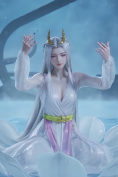 Chinese mature woman, sitting cross-legged on a white lotus throne, wearing a golden hat on her head, anime style appearance, white neon bra, white Hanfu, golden crown, eyes closed, girl, jewelry, long hair, white hair, cute, Hanfu, Dunhuang, hold out the hydrangeas with both hands, hold them tightly, look at the hug, look at the body, the cute little princess, Mrs. Dragon, wearing a pair of dragon horns on her head ((Masterpiece, best quality)),(( Well structured, well composed, luminous), translucent woman), tiny gold accents, beautiful and intricate details, ethereal light, whimsical imagining, art by Michif blue theme, off original, view ( beautiful),transparent,shiny_clothes,pink chest pleated skirt,white with yellow pimples,pink pimples,((water drops)),wet clothes,((beautiful details water)),(( Floating)), dynamic angle, ((beautiful details of the butterfly)), ((beautiful details of the stars)), ((slip dress)), particles, (beautiful details of the starry sky), (hazy fog), (beautiful Fragments) details), (((standing on the sea))), yellow belt, purple belt with white belt, light green belt,(big breasts:1.89),,(Pure blue sea:1.6),Xyuanyao