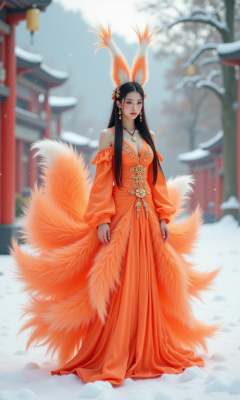 the nine tailed fox, with nine oversized fluffy tails and white fox ears, stands out with makeup, chinese clothing, hair accessories, jewelry, earrings, wide sleeves, and bare shoulders. it is sexy, seductive, and semi transparent on the snowy mountains. filled with incredibly rich details, creating realistic visual effects. realistic photography, the image shows a young woman standing in a snowy landscape with trees and a red gate in the background. she is wearing a long, flowing orange dress with a high neckline and long sleeves. the dress is **** of a luxurious fabric with a large, feathered skirt that cascades down to the floor. the woman has long dark hair styled in a dramatic updo with large, pointed ears on top of her head. she has a gold necklace and earrings that add a touch of elegance to her look. the overall mood of the image is magical and mystical., nine tailed fox, Ultimate quality, extremely detailed, ultra-fine face, ultra-high definition 8K, 8K resolution,