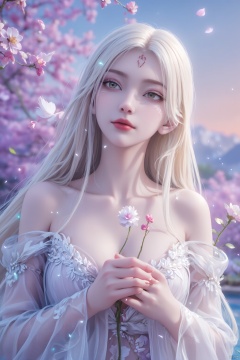 Masterpiece, super high quality, crazy details, dazzling colorful light, intricate details, ultra-detailed, realistic: 1.4, 1 girl, eyes half-open, holding flowers in her hands. , bright colors, charming face, collarbone, solitude, bare shoulders, flowing feathers, light white tulle, looking up, light yellow hair with white gradient, long hair with tiny curls, white eyelashes, dreamy and beautiful , anime aesthetic, girl in crystal wallpaper, in soft focus realism style, lilac background, anime beauty by the pool, expressive hair, surreal, sparkling, textured skin, super details, best quality, 8k ,