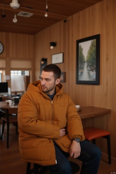 A man, enveloped in a rich mustard- colored puffer jacket, sits pensively in a cozy cafe setting, lost in thought as he gazes off to the side. The wooden interior, complete with a ceiling fan, provides a warm backdrop. A framed landscape picture adorns the wall, adding depth to the scene. Soft lighting and inviting textures create a modern, yet welcoming atmosphere.