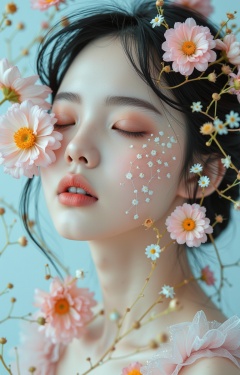 A serene and ethereal portrait of a woman adorned with delicate flowers, her eyes gently closed as if in tranquility or perhaps lost within an artistic dreamscape