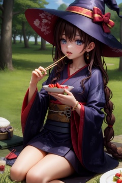 official wallpaper,.,<lora:2细节SYK_Mild detail adjuster_V1.0_256(MAX):0.45>,.,.,.,.,.,.,1girl,solo,outdoors,food,jewelry,twin braids,braid,sitting,earrings,tree,holding,hat,blue eyes,chopsticks,long hair,witch hat,plate,day,fruit,bangs,wide sleeves,japanese clothes,book,bracelet,black kimono,kimono,eating,closed mouth,long sleeves,holding chopsticks,brown hair,witch,grass,sky,