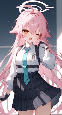(score_9,score_8_up,score_7_up), 1girl,solo,(masterpiece:1.3),( beautiful:1.2),(high quality:1.2),(finely detailed:1.2),extremely detailed CG unity 8k wallpaper,best quality,a very delicate and beautiful,perfect fingers,1girl, solo, long hair, looking at viewer, blush, open mouth, bangs, skirt, shirt, gloves, long sleeves, hair between eyes, very long hair, white shirt, pink hair, ahoge, cowboy shot, pleated skirt, one eye closed, necktie, black gloves, fang, collared shirt, hand up, fingerless gloves, black skirt, orange eyes, gun, plaid, halo, plaid skirt, blue necktie, id card, ;o, hoshino \(blue archive\), hoshinoBA,