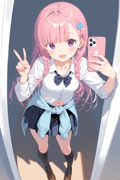 1girl, :d, bangs, black_legwear, black_skirt, blush, bow, braid, breasts, brown_footwear, cardigan, cardigan_around_waist, cellphone, clothes_around_waist, collarbone, double_v, eyebrows_visible_through_hair, full_body, hair_ornament, holding, holding_phone, kneehighs, loafers, long_hair, long_sleeves, looking_at_phone, looking_at_viewer, medium_breasts, navel, open_mouth, phone, pink_hair, pleated_skirt, purple_eyes, school_uniform, selfie, shirt, shoes, simple_background, skirt, smartphone, smile, solo, standing, sweater_around_waist, taking_picture, v, white_background, white_shirt