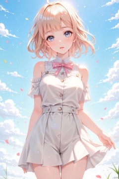 (((masterpiece))), (((best quality))), ((ultradetailed)), (illustration), (1 girl), (solo), ((an extremely delicate and beautiful)), little girl, ((beautiful detailed sky)), beautiful detailed eyes, side blunt bangs, hairs between eyes, ribbons, bowties, buttons, bare shoulders, (small breast), blank stare, pleated skirt, close to viewer, ((breeze)), Flying splashes, Flying petals, wind